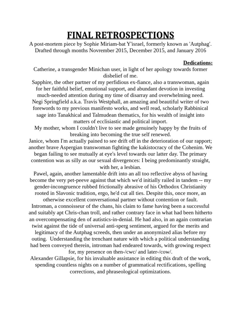 A post-mortem piece by Sophie Miriam-bat Y'israel, formerly known as'Autphag'.Drafted through months o!rember "#$%, December "#$%, and &anuary"#$