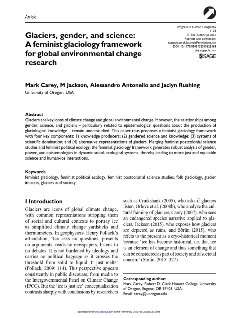 framework to analyzehuman-glacier dynamics, glacier narratives and discourse, and claims to credibility and author-ity of glaciological knowledge through the lensof feminist studies. As a point of departure, weuse ‘glaciology’ in an encompassing sense thatexceeds the immediate scientific meanings of the label, much as feminist critiques of geogra- phy, for example, have expanded what it is that‘geography’ might mean vis-a`-vis geographicknowledge (Domosh, 1991; Rose, 1993). Assuch, feminist glaciology has four aspects:(1)