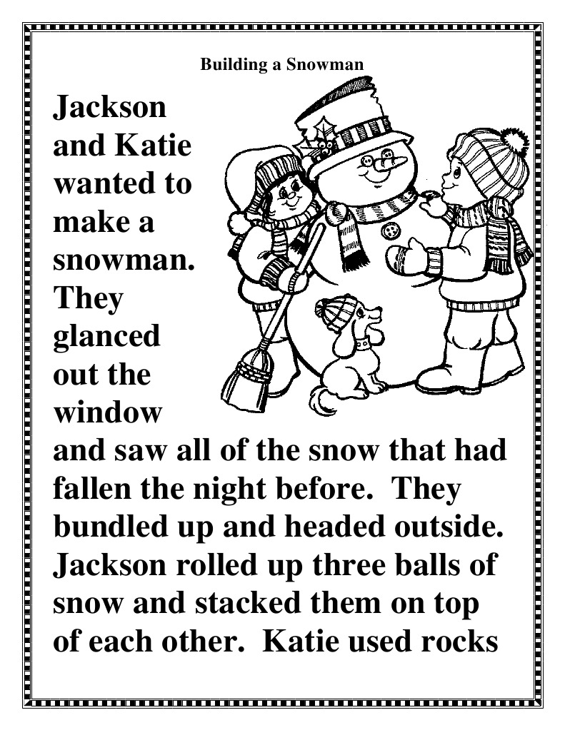 Jackson and Katie wanted to make a snowman. They glanced out the window and saw all of the snow that had fallen the night before. They bundled up and headed outside. Jackson rolled up three balls of snow and stacked them on top of each other. Katie used rocks