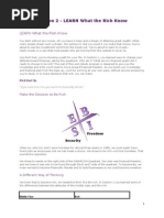 in the end and youll probably make ten to 100 to 1,000 times more money. So which one is smarter? It is their mental reality that makes them poor. It is what we think is smart and what we think is risky that determines our socioeconomic standings in life. We do the same things but we operate from a different mind-set. I operate from a rich persons mind-set and your parents operate from a middle-class mind set. You do not have to be rich or poor to be greedy or generous. Doing more and more with less and less is one form of being generous. The easiest way to become rich is by being generous. Anytime I want to earn more money, all I have to do is ask myself how I can serve more people. Most poor and middle class expect to receive pay raises the longer they work at a job. It is called seniority or tenure. Can you see how wanting more money for doing the same amount of work can be greedy. Or wanting to be paid overtime or wanting to be paid extra if the job the person does is outside the job description. In my world, if I want more money, I first need to do more and more for less and less money, for more and more people, then I become rich. Henry Ford became one of the riches men in the world because he provided automobiles for more and more people for less and less cost. A big business owner will do his or her best to build a system to serve as many people as possible. A B business owner uses a system to serve as many people as possible. In your family, what was the reality on the following subjects? Smart Risky 1. Job security 2. Building a business 3. A big house 4. Apartment houses 5. Saving money 6. Investing money 7. The rich are greedy _____ _____ _____ _____ _____ _____ _____ _____ _____ _____ _____ _____ _____ _____