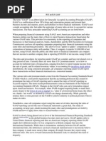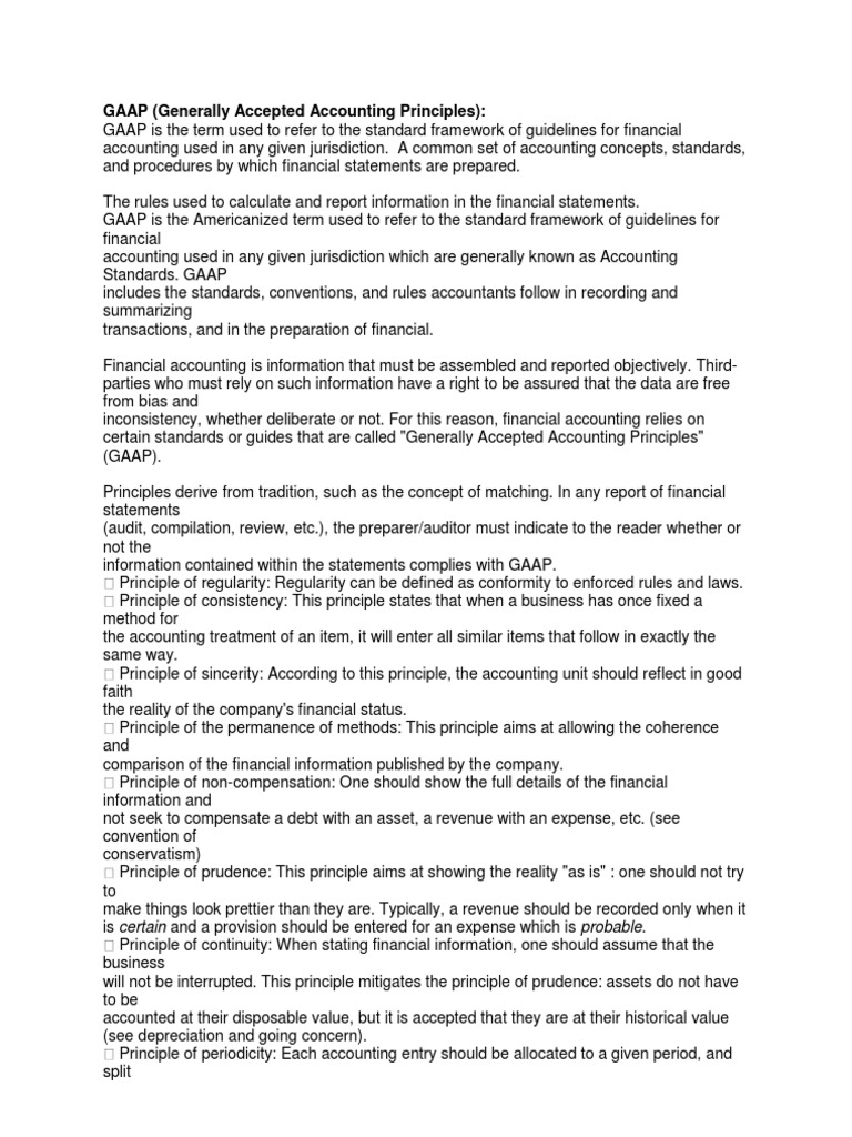 financial accounting used in any given jurisdiction. A common set of accounting concepts, standards, and procedures by which financial statements are prepared. The rules used to calculate and report information in the financial statements. GAAP is the Americanized term used to refer to the standard framework of guidelines for financial accounting used in any given jurisdiction which are generally known as Accounting Standards. GAAP includes the standards, conventions, and rules accountants follow in recording and summarizing transactions, and in the preparation of financial. Financial accounting is information that must be assembled and reported objectively. Thirdparties who must rely on such information have a right to be assured that the data are free from bias and inconsistency, whether deliberate or not. For this reason, financial accounting relies on certain standards or guides that are called "Generally Accepted Accounting Principles" (GAAP). Principles derive from tradition, such as the concept of matching. In any report of financial statements (audit, compilation, review, etc.), the preparer/auditor must indicate to the reader whether or not the information contained within the statements complies with GAAP. Principle of regularity: Regularity can be defined as conformity to enforced rules and laws. Principle of consistency: This principle states that when a business has once fixed a method for the accounting treatment of an item, it will enter all similar items that follow in exactly the same way. Principle of sincerity: According to this principle, the accounting unit should reflect in good faith the reality of the company's financial status. Principle of the permanence of methods: This principle aims at allowing the coherence and comparison of the financial information published by the company. Principle of non-compensation: One should show the full details of the financial information and not seek to compensate a debt with an asset, a revenue with an expense, etc. (see convention of conservatism) Principle of prudence: This principle aims at showing the reality "as is" : one should not try to make things look prettier than they are. Typically, a revenue should be recorded only when it is certain and a provision should be entered for an expense which is probable. Principle of continuity: When stating financial information, one should assume that the business will not be interrupted. This principle mitigates the principle of prudence: assets do not have to be accounted at their disposable value, but it is accepted that they are at their historical value (see depreciation and going concern). Principle of periodicity: Each accounting entry should be allocated to a given period, and split