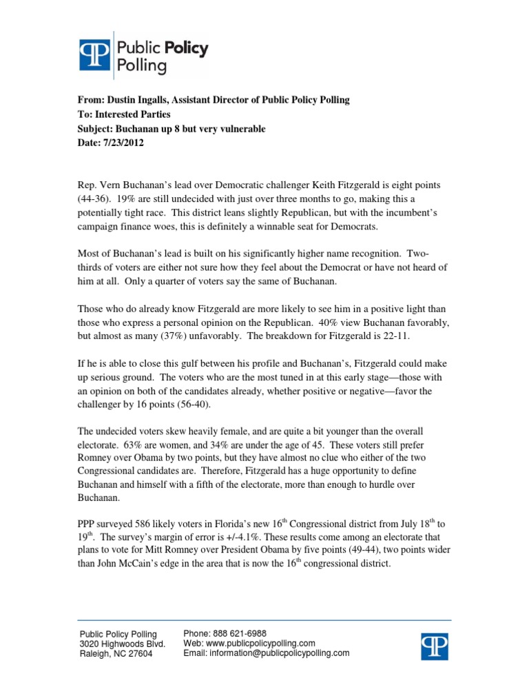From: Dustin Ingalls, Assistant Director of Public Policy Polling To: Interested Parties Subject: Buchanan up 8 but very vulnerable Date: 7/23/2012