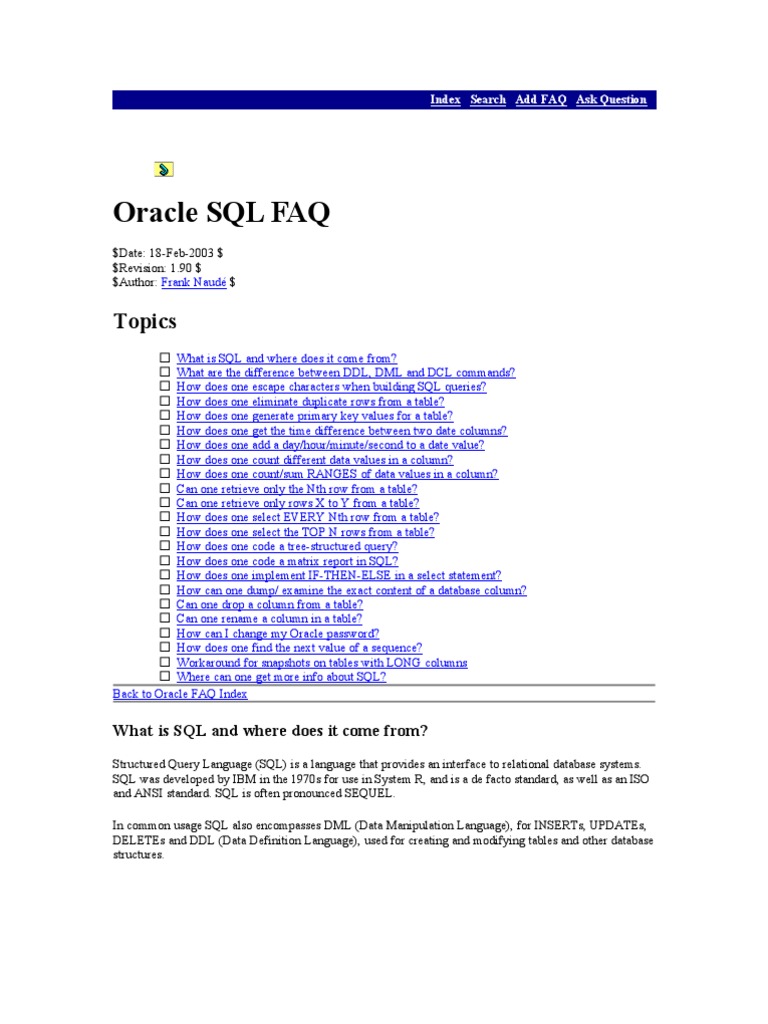 What is SQL and where does it come from? What are the difference between DDL, DML and DCL commands? How does one escape characters when building SQL queries? How does one eliminate duplicate rows from a table? How does one generate primary key values for a table? How does one get the time difference between two date columns? How does one add a day/hour/minute/second to a date value? How does one count different data values in a column? How does one count/sum RANGES of data values in a column? Can one retrieve only the Nth row from a table? Can one retrieve only rows X to Y from a table? How does one select EVERY Nth row from a table? How does one select the TOP N rows from a table? How does one code a tree-structured query? How does one code a matrix report in SQL? How does one implement IF-THEN-ELSE in a select statement? How can one dump/ examine the exact content of a database column? Can one drop a column from a table? Can one rename a column in a table? How can I change my Oracle password? How does one find the next value of a sequence? Workaround for snapshots on tables with LONG columns Where can one get more info about SQL? Back to Oracle FAQ Index
