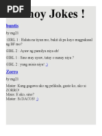 MAID: Ewan ko nga po eh, pag-off ko ng washing machine patay na. "Lasing" Isang lasing nasalubong ang matabang babaeng may aso... Lasing: Hoy, san mo nakuha 'yang baboy? Babae: Aso ito hindi baboy! Lasing: Wag kang sumabat! 'Yong aso ang kausap ko! Sa bahay..... Anak na babae: Tay! Nagtumbling ako sa school! Tatay: Diba sinabihan na kita na wag magtumbling sa school dahil makikita panti mo? Anak: Okay lang poh tay, tnago ko poh ang panty ko sa bag habang nagtu-tumbling... LASENGGO: Miss ang panget mo! BABAE: Kapal ng mukha mo! Ikaw naman lasingero. LASENGGO: Haler? Bukas di na ako lasing, ikaw bukas panget pa rin!.. Nurse:Nasa isip mo ba ang pamilya mo? Baliw:Oo naman! Xmpre! Nurse:Asan ba pamilya mo? Baliw:Nasa isip ko nga eh! Adik ka ba? Kid: Yaya: Kid: Yaya: Yaya look, boats! Dows are not boats, dey re yachts. Yaya, spell yachts? Yor rayt, dey are boats.