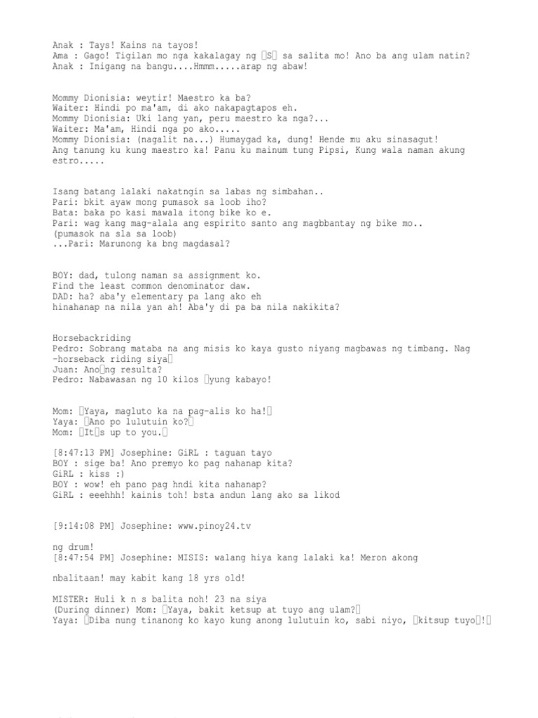 Anak : Inigang na bangu....Hmmm.....arap ng abaw! Mommy Dionisia: weytir! Maestro ka ba? Waiter: Hindi po ma'am, di ako nakapagtapos eh. Mommy Dionisia: Uki lang yan, peru maestro ka nga?... Waiter: Ma'am, Hindi nga po ako..... Mommy Dionisia: (nagalit na...) Humaygad ka, dung! Hende mu aku sinasagut! Ang tanung ku kung maestro ka! Panu ku mainum tung Pipsi, Kung wala naman akung estro..... Isang batang lalaki nakatngin sa labas ng simbahan.. Pari: bkit ayaw mong pumasok sa loob iho? Bata: baka po kasi mawala itong bike ko e. Pari: wag kang mag-alala ang espirito santo ang magbbantay ng bike mo.. (pumasok na sla sa loob) ...Pari: Marunong ka bng magdasal? BOY: dad, tulong naman sa assignment ko. Find the least common denominator daw. DAD: ha? aba'y elementary pa lang ako eh hinahanap na nila yan ah! Aba'y di pa ba nila nakikita? Horsebackriding Pedro: Sobrang mataba na ang misis ko kaya gusto niyang magbawas ng timbang. Nag -horseback riding siya Juan: Ano ng resulta? Pedro: Nabawasan ng 10 kilos yung kabayo! Mom: Yaya, magluto ka na pag-alis ko ha! Yaya: Ano po lulutuin ko? Mom: It s up to you. [Link] PM] Josephine: GiRL : taguan tayo BOY : sige ba! Ano premyo ko pag nahanap kita? GiRL : kiss :) BOY : wow! eh pano pag hndi kita nahanap? GiRL : eeehhh! kainis toh! bsta andun lang ako sa likod [Link] PM] Josephine: [Link] ng drum! [Link] PM] Josephine: MISIS: walang hiya kang lalaki ka! Meron akong nbalitaan! may kabit kang 18 yrs old! MISTER: Huli k n s balita noh! 23 na siya (During dinner) Mom: Yaya, bakit ketsup at tuyo ang ulam? Yaya: Diba nung tinanong ko kayo kung anong lulutuin ko, sabi niyo,