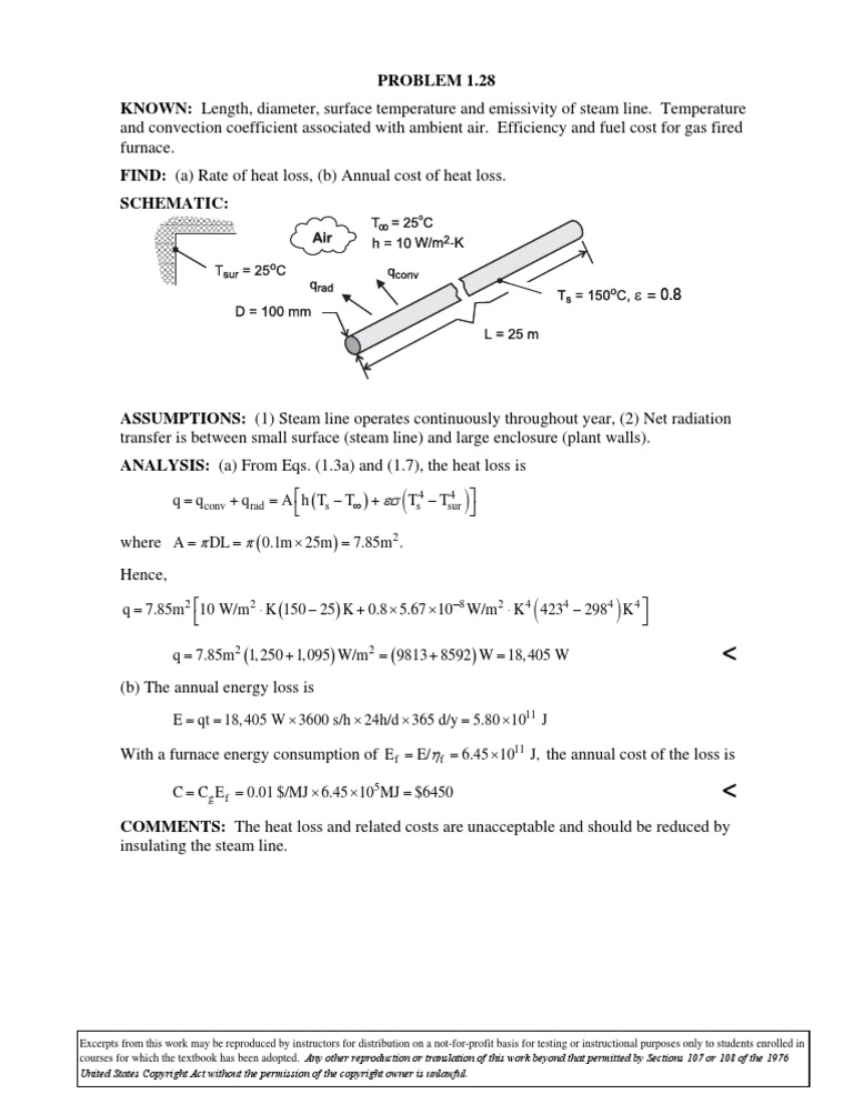 PROBLEM 1.28 KNOWN: Length, diameter, surface temperature and emissivity of steam line.