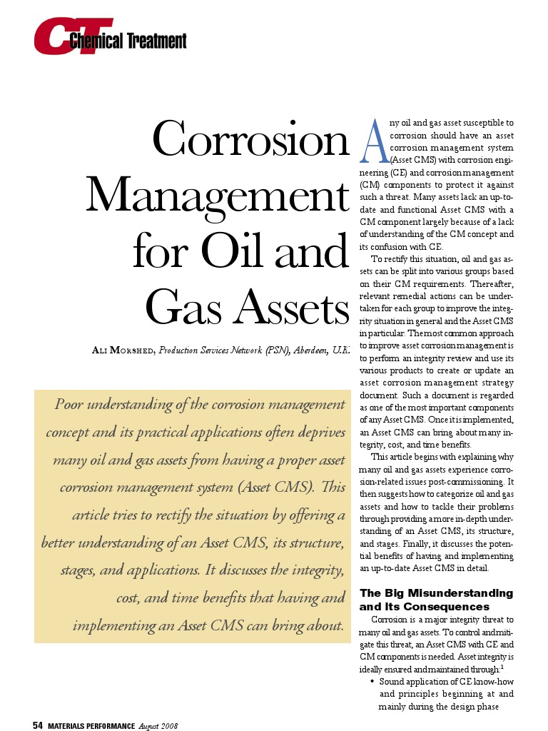 ny oil and gas asset susceptible to corrosion should have an asset corrosion management system (Asset CMS) with corrosion engineering (CE) and corrosion management (CM) components to protect it against such a threat. Many assets lack an up-todate and functional Asset CMS with a CM component largely because of a lack of understanding of the CM concept and its confusion with CE. To rectify this situation, oil and gas assets can be split into various groups based on their CM requirements. Thereafter, relevant remedial actions can be undertaken for each group to improve the integrity situation in general and the Asset CMS in particular. The most common approach ALI MORSHED, Production Services Network (PSN), Aberdeen, U.K. to improve asset corrosion management is to perform an integrity review and use its various products to create or update an asset corrosion management strategy document. Such a document is regarded as one of the most important components of any Asset CMS. Once it is implemented, an Asset CMS can bring about many integrity, cost, and time benets. This article begins with explaining why many oil and gas assets experience corrosion-related issues post-commissioning. It then suggests how to categorize oil and gas assets and how to tackle their problems through providing a more in-depth understanding of an Asset CMS, its structure, and stages. Finally, it discusses the potential benets of having and implementing an up-to-date Asset CMS in detail.