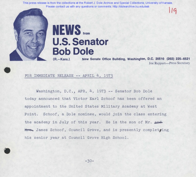 Victor Earl Schoof nominted for Service Academy by US Senator Bob Dole