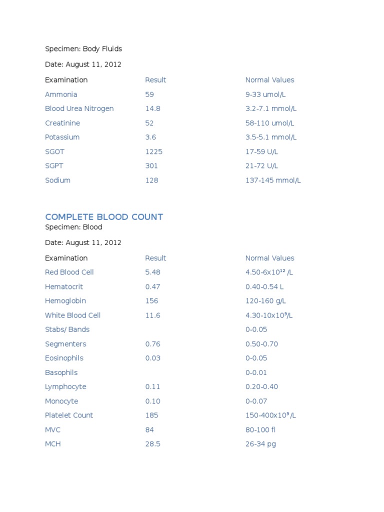 Specimen: Body Fluids Date: August 11, 2012 Examination Ammonia Blood Urea Nitrogen Creatinine Result To follow 14.8 52 Normal Values 9-33 umol/L 3.2-7.1 mmol/L 58-110 umol/L