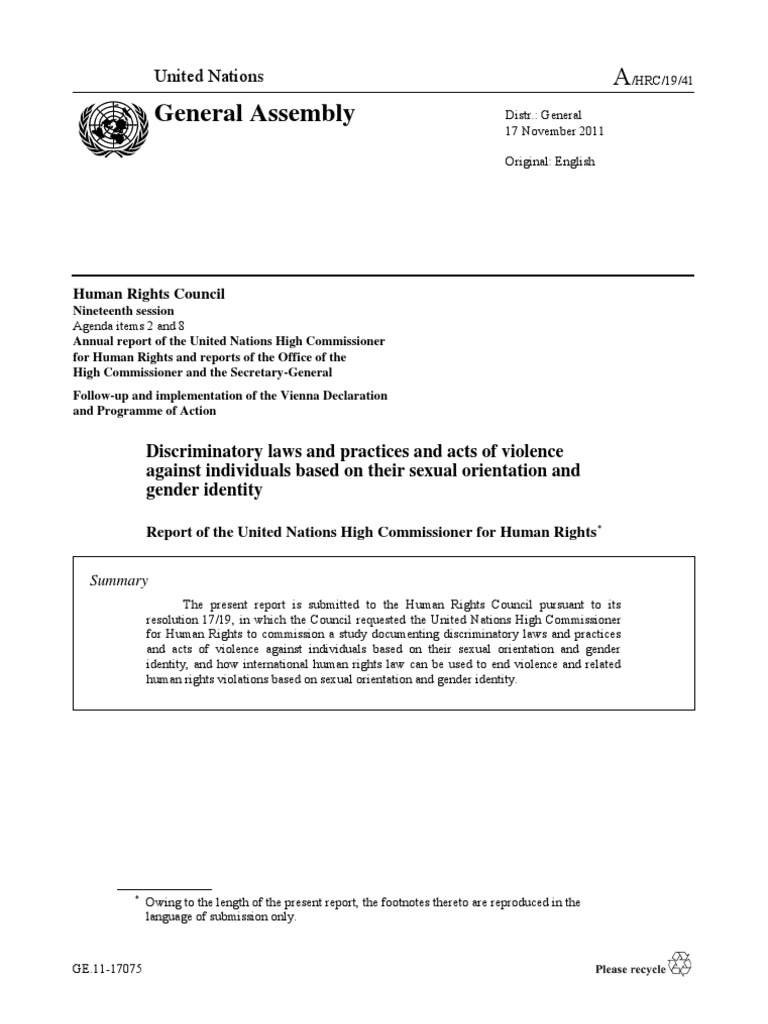 The present report is submitted to the Human Rights Council pursuant to its resolution 17/19, in which the Council requested the United Nations High Commissioner for Human Rights to commission a study documenting discriminatory laws and practices and acts of violence against individuals based on their sexual orientation and gender identity, and how international human rights law can be used to end violence and related human rights violations based on sexual orientation and gender identity.