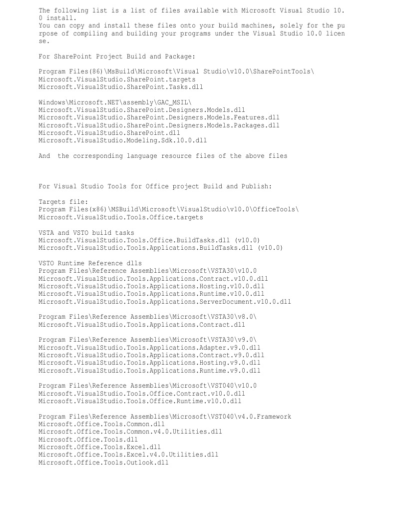 For Visual Studio Tools for Office project Build and Publish: Targets file: Program Files(x86)\MSBuild\Microsoft\VisualStudio\v10.0\OfficeTools\ [Link] VSTA and VSTO build tasks [Link] (v10.0) [Link] (v10.0) VSTO Runtime Reference dlls Program Files\Reference Assemblies\Microsoft\VSTA30\v10.0 [Link] [Link] [Link] [Link] Program Files\Reference Assemblies\Microsoft\VSTA30\v8.0\ [Link] Program Files\Reference Assemblies\Microsoft\VSTA30\v9.0\ [Link] [Link] [Link] [Link] Program Files\Reference Assemblies\Microsoft\VST040\v10.0 [Link] [Link] Program Files\Reference Assemblies\Microsoft\VST040\[Link] [Link] [Link] [Link] [Link] [Link] [Link]