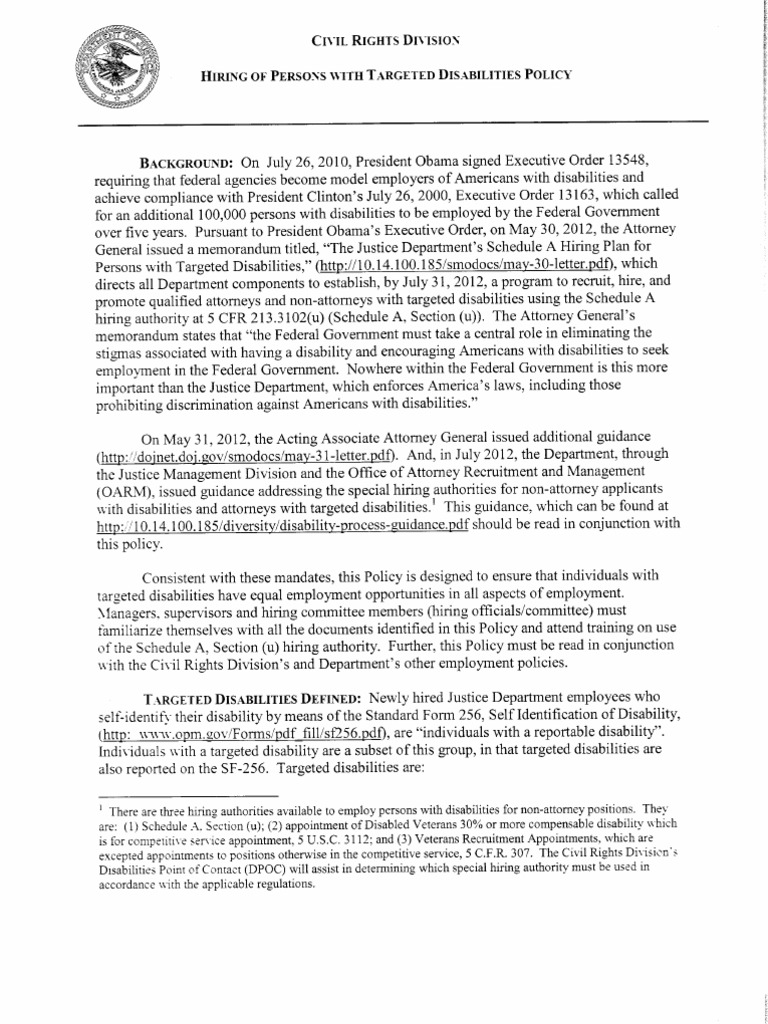 The document outlines the Justice Department's policy for hiring individuals with targeted disabilities. It defines targeted disabilities and establishes procedures for recruiting, interview…
