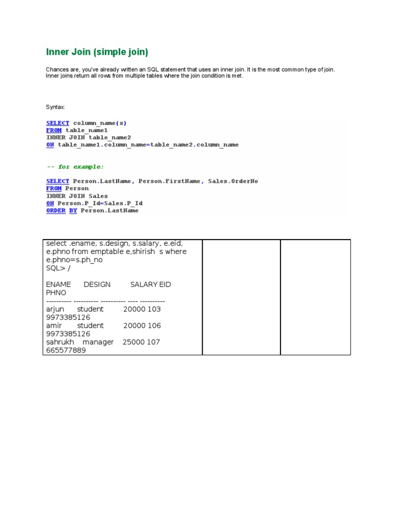 select .ename, [Link], [Link], [Link], [Link] from emptable e,shirish s where [Link]=s.ph_no SQL> / ENAME DESIGN SALARY EID PHNO ---------- ---------- ---------- ---- ---------arjun student 20000 103 9973385126 amir student 20000 106 9973385126 sahrukh manager 25000 107 665577889