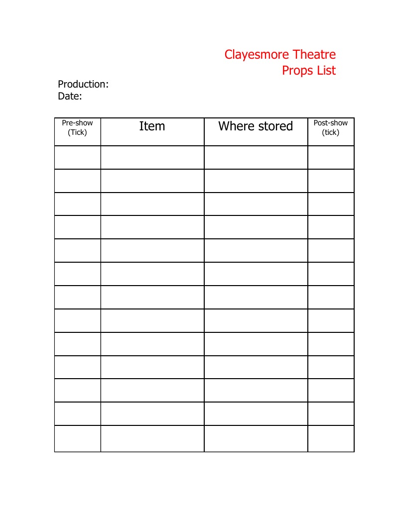 Clayesmore Theatre Props Checklist