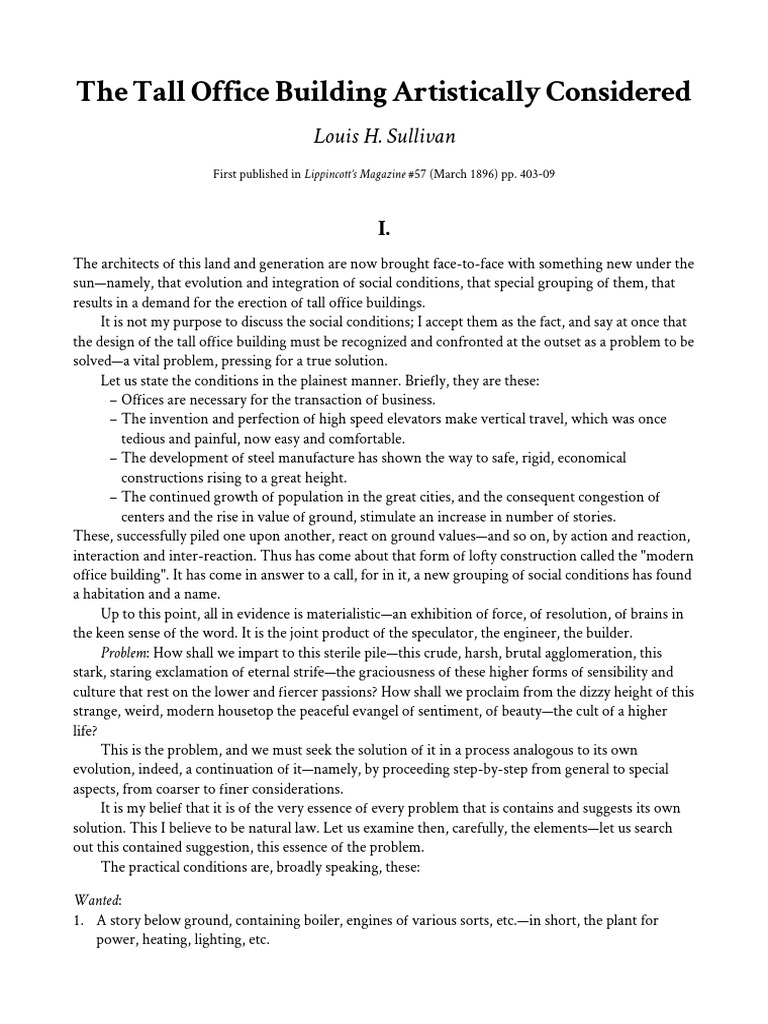 Louis Sullivan's 1896 essay. The original magazine scan is available here: http://archive.org/details/tallofficebuildi00sull