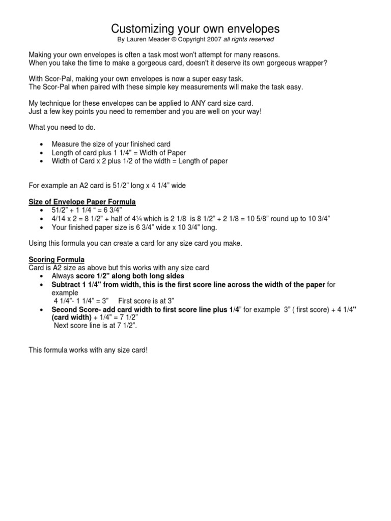 For example an A2 card is 51/2" long x 4 1/4 wide Size of Envelope Paper Formula 51/2 + 1 1/4 = 6 3/4" 4/14 x 2 = 8 1/2" + half of 4 which is 2 1/8 is 8 1/2 + 2 1/8 = 10 5/8 round up to 10 3/4 Your finished paper size is 6 3/4 wide x 10 3/4" long. Using this formula you can create a card for any size card you make. Scoring Formula Card is A2 size as above but this works with any size card Always score 1/2" along both long sides Subtract 1 1/4" from width, this is the first score line across the width of the paper for example 4 1/4- 1 1/4 = 3 First score is at 3 Second Score- add card width to first score line plus 1/4 for example 3 ( first score) + 4 1/4" (card width) + 1/4" = 7 1/2 Next score line is at 7 1/2.