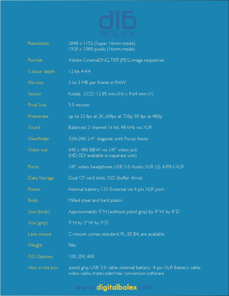 2048 x 1152 (Super 16mm mode) 1920 x 1080 pixels (16mm mode) Adobe CinemaDNG, TIFF, JPEG image sequences 12 bit 4:4:4 2 to 3 MB per frame in RAW Kodak CCD: 12.85 mm (H) x 9.64 mm (V) 5.5 micron up to 32 fps at 2K, 60fps at 720p, 90 fps at 480p Balanced, 2 channel 16 bit, 48 kHz via XLR 320x240, 2.4 diagonal, with Focus Assist 640 x 480 B&W via 1/8 video jack (HD-SDI available in separate unit) 1/8 video, headphone, USB 3.0, Audio XLR (2), 4-PIN XLR Dual CF card slots, SSD (buffer drive) Internal battery, 12V External via 4 pin XLR port Milled steel and hard plastic Approximately 5H (without pistol grip) by 4W by 8D 5H by 2W by 5D C-mount comes standard, PL, EF, B4, are available 5lbs 100, 200, 400 pistol grip, USB 3.0 cable, internal battery, 4 pin XLR Battery cable, video cable, transcoder/raw conversion software