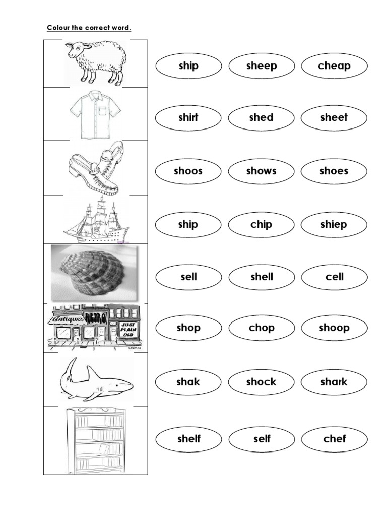 The document contains a list of words and the task is to colour the correct spelling of various words containing "sh" sounds at the beginning. The words include ship, shoes, shop, shelf, shock, shark and others for the reader to identify the properly spelled versions.