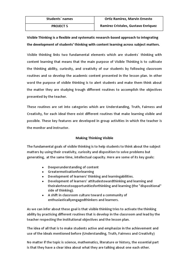 Visible Thinking is a flexible and systematic research-based approach to integrating the development of students' thinking with content learning across subject matters. Visible thinking links two fundamental elements which are students thinking with content learning that means that the main purpose of Visible Thinking is to cultivate the thinking ability, curiosity, and creativity of our students by following classroom routines and so develop the academic content presented in the lesson plan. In other word the purpose of visible thinking is to alert students and make them think about the matter they are studying trough different routines to accomplish the objectives presented by the teacher. These routines are set into categories which are Understanding, Truth, Fairness and Creativity, for each ideal there exist different routines that make learning visible and possible. These key features are developed in group activities in which the teacher is the monitor and instructor. Making Thinking Visible The fundamental goals of visible thinking is to help students to think about the subject matters by using their creativity, curiosity and disposition to solve problems but generating, at the same time, intellectual capacity. Here are some of its key goals:
