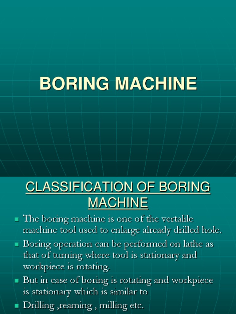 The boring machine is one of the vertalile machine tool used to enlarge already drilled hole. Boring operation can be performed on lathe as that of turning where tool is stationary and workpiece is rotating. But in case of boring is rotating and workpiece is stationary which is similar to Drilling ,reaming , milling etc. Boring machines can be classified based on position of boring tools, accuracy of work required etc.