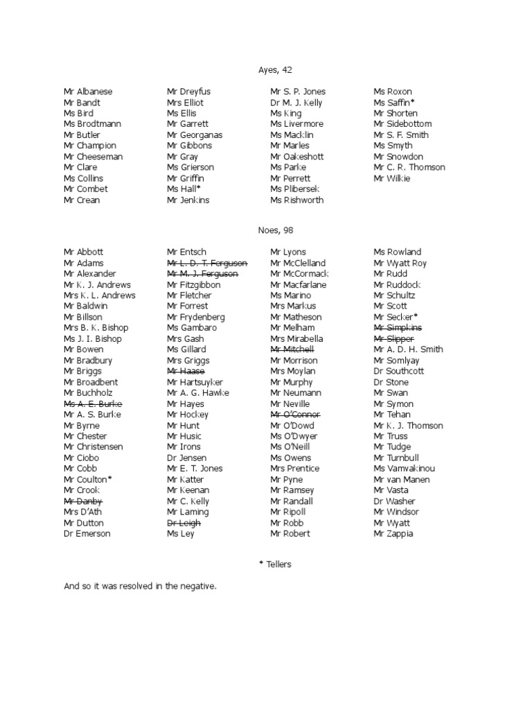 Ms Ellis Mr Garrett Mr Georganas Mr Gibbons Mr Gray Ms Grierson Mr Griffin Ms Hall* Mr Jenkins Mr S. P. Jones Dr M. J. Kelly Ms King Ms Livermore Ms Macklin Mr Marles Mr Oakeshott Ms Parke Mr Perrett Ms Plibersek Ms Rishworth Noes, 98 Mr Abbott Mr Adams Mr Alexander Mr K. J. Andrews Mrs K. L. Andrews Mr Baldwin Mr Billson Mrs B. K. Bishop Ms J. I. Bishop Mr Bowen Mr Bradbury Mr Briggs Mr Broadbent Mr Buchholz Ms A. E. Burke Mr A. S. Burke Mr Byrne Mr Chester Mr Christensen Mr Ciobo Mr Cobb Mr Coulton* Mr Crook Mr Danby Mrs DAth Mr Dutton Dr Emerson Mr Entsch Mr L. D. T. Ferguson Mr M. J. Ferguson Mr Fitzgibbon Mr Fletcher Mr Forrest Mr Frydenberg Ms Gambaro Mrs Gash Ms Gillard Mrs Griggs Mr Haase Mr Hartsuyker Mr A. G. Hawke Mr Hayes Mr Hockey Mr Hunt Mr Husic Mr Irons Dr Jensen Mr E. T. Jones Mr Katter Mr Keenan Mr C. Kelly Mr Laming Dr Leigh Ms Ley Mr Lyons Mr McClelland Mr McCormack Mr Macfarlane Ms Marino Mrs Markus Mr Matheson Mr Melham Mrs Mirabella Mr Mitchell Mr Morrison Mrs Moylan Mr Murphy Mr Neumann Mr Neville Mr OConnor Mr ODowd Ms ODwyer Ms ONeill Ms Owens Mrs Prentice Mr Pyne Mr Ramsey Mr Randall Mr Ripoll Mr Robb Mr Robert * Tellers And so it was resolved in the negative. Ms Rowland Mr Wyatt Roy Mr Rudd Mr Ruddock Mr Schultz Mr Scott Mr Secker* Mr Simpkins Mr Slipper Mr A. D. H. Smith Mr Somlyay Dr Southcott Dr Stone Mr Swan Mr Symon Mr Tehan Mr K. J. Thomson Mr Truss Mr Tudge Mr Turnbull Ms Vamvakinou Mr van Manen Mr Vasta Dr Washer Mr Windsor Mr Wyatt Mr Zappia Ms Roxon Ms Saffin* Mr Shorten Mr Sidebottom Mr S. F. Smith Ms Smyth Mr Snowdon Mr C. R. Thomson Mr Wilkie