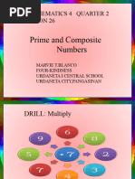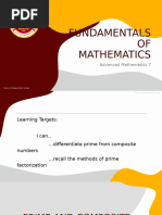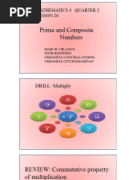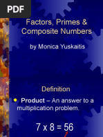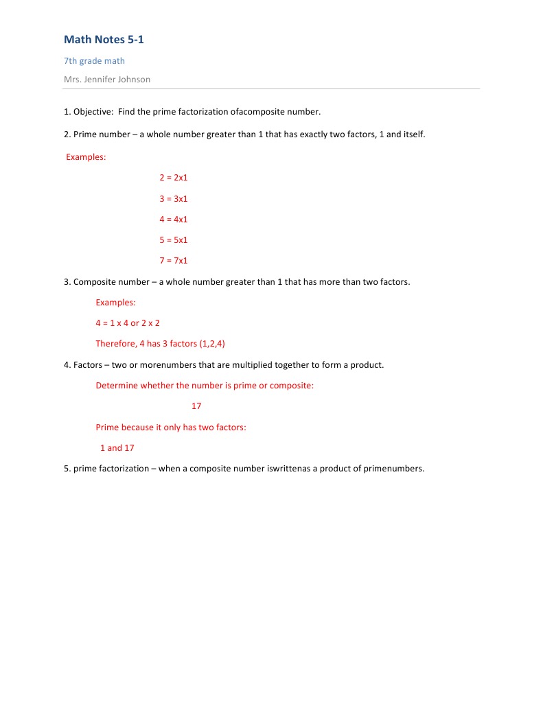 7th grade math Mrs. Jennifer Johnson 1. Objective: Find the prime factorization ofacomposite number. 2. Prime number a whole number greater than 1 that has exactly two factors, 1 and itself. Examples: 2 = 2x1 3 = 3x1 4 = 4x1 5 = 5x1 7 = 7x1 3. Composite number a whole number greater than 1 that has more than two factors. Examples: 4 = 1 x 4 or 2 x 2 Therefore, 4 has 3 factors (1,2,4) 4. Factors two or morenumbers that are multiplied together to form a product. Determine whether the number is prime or composite: 17 Prime because it only has two factors: 1 and 17 5. prime factorization when a composite number iswrittenas a product of primenumbers.