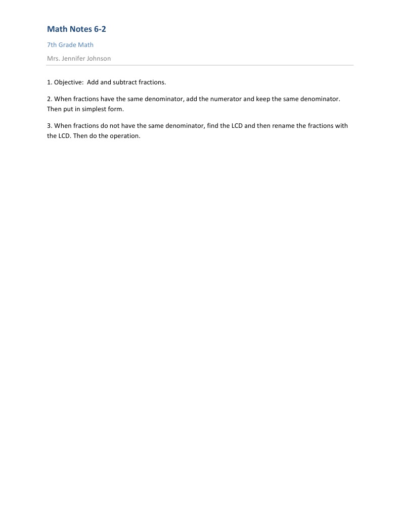 7th Grade Math Mrs. Jennifer Johnson 1. Objective: Add and subtract fractions. 2. When fractions have the same denominator, add the numerator and keep the same denominator. Then put in simplest form. 3. When fractions do not have the same denominator, find the LCD and then rename the fractions with the LCD. Then do the operation.