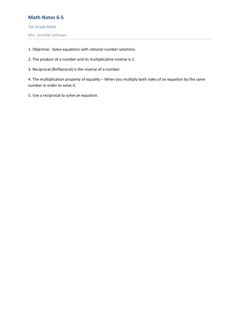 7th Grade Math Mrs. Jennifer Johnson 1. Objective: Solve equations with rational number solutions. 2. The product of a number and its multiplicative inverse is 1. 3. Reciprocal (Refliprocal) is the inverse of a number. 4. The multiplication property of equality When you multiply both sides of an equation by the same number in order to solve it. 5. Use a reciprocal to solve an equation.