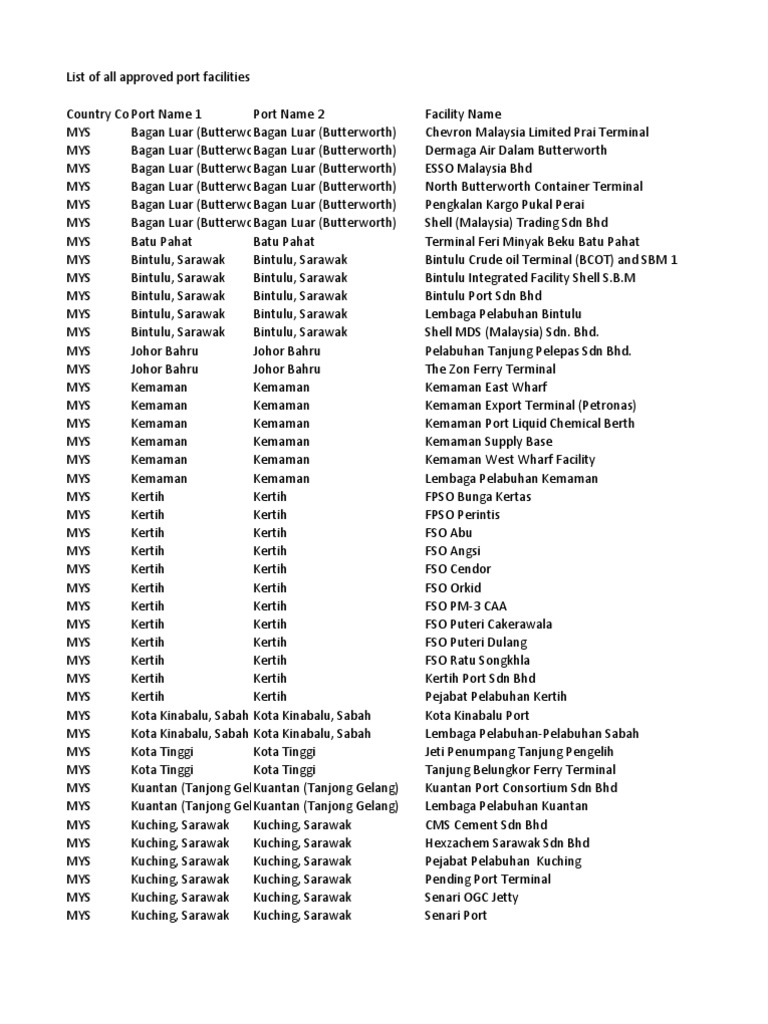 List of all approved port facilities Country Code Name 1 Port Port Name 2 MYS Bagan Luar (Butterworth)