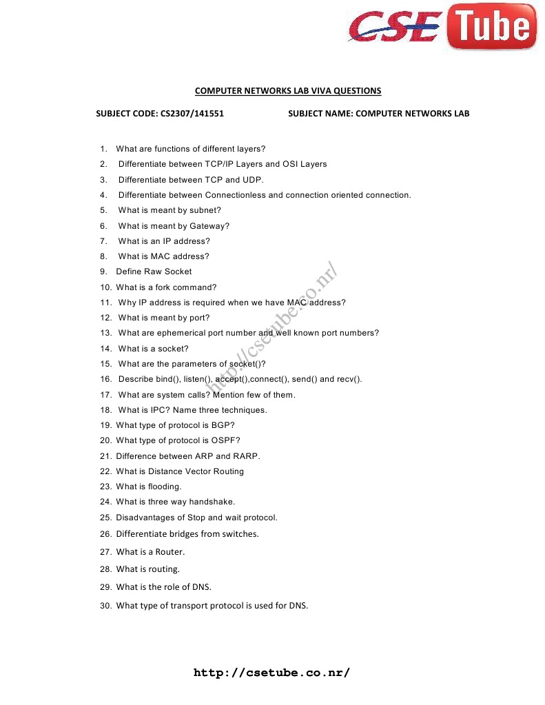COMPUTER NETWORKS LAB VIVA QUESTIONS SUBJECT CODE: CS2307/141551