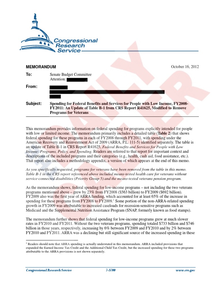 This memorandum provides information on federal spending for programs explicitly intended for people with low or limited income. The memorandum primarily includes a detailed table (Table 2) that shows federal spending for these programs in each of FY2008 through FY2011, with spending under the American Recovery and Reinvestment Act of 2009 (ARRA, P.L. 111-5) identified separately. The table is an update of Table B-1 in CRS Report R41625, Federal Benefits and Services for People with Low Income: Programs, Policy, and Spending. Readers are referred to that report for important context and descriptions of the included programs and their categories (e.g., health, cash aid, food assistance, etc.). That report also includes a methodology appendix, a version of which appears at the end of this memo. As you specifically requested, programs for veterans have been removed from the table in this memo. Table B-1 in the CRS report referenced above included means-tested health care for veterans without service-connected disabilities (Priority Group 5) and the means-tested veterans pension program. As the memorandum shows, federal spending for low-income programs not including the two veterans programs mentioned above grew by 23% from FY2008 ($563 billion) to FY2009 ($692 billion). FY2009 also was the first year of ARRA funding, which accounted for at least 65% of the increase in spending for these programs from FY2008 to FY2009.1 Some portion of the non-ARRA-related spending growth in FY2009 was attributable to increased caseloads for recession-sensitive programs such as Medicaid and the Supplemental Nutrition Assistance Program (SNAP, formerly known as food stamps). The memorandum further shows that federal spending for low-income programs grew at much slower rates in FY2010 and FY2011. Without the two veterans programs, spending totaled $733 billion and $746 billion in those years, respectively, increasing by 6% between FY2009 and FY2010 and by 2% between FY2010 and FY2011. ARRA was a declining but still significant source of the increased spending in these