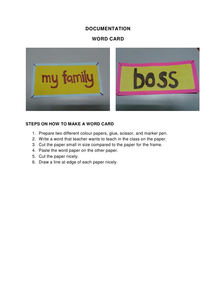 STEPS ON HOW TO MAKE A WORD CARD 1. 2. 3. 4. 5. 6. Prepare two different colour papers, glue, scissor, and marker pen. Write a word that teacher wants to teach in the class on the paper. Cut the paper small in size compared to the paper for the frame. Paste the word paper on the other paper. Cut the paper nicely. Draw a line at edge of each paper nicely.