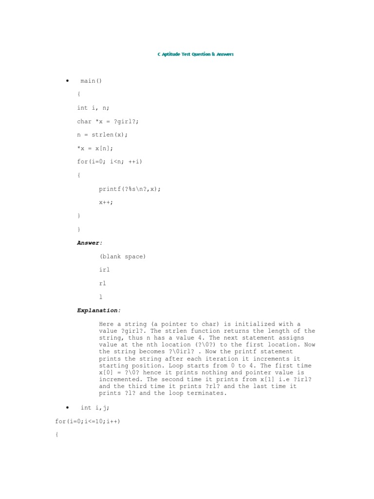 int i, n; char *x = ?girl?; n = strlen(x); *x = x[n]; for(i=0; i<n; ++i) { printf(?%s\n?,x); x++; } } Answer: (blank space) irl rl l Explanation: Here a string (a pointer to char) is initialized with a value ?girl?. The strlen function returns the length of the string, thus n has a value 4. The next statement assigns value at the nth location (?\0?) to the first location. Now the string becomes ?\0irl? . Now the printf statement prints the string after each iteration it increments it starting position. Loop starts from 0 to 4. The first time x[0] = ?\0? hence it prints nothing and pointer value is incremented. The second time it prints from x[1] i.e ?irl? and the third time it prints ?rl? and the last time it prints ?l? and the loop terminates. int i,j;