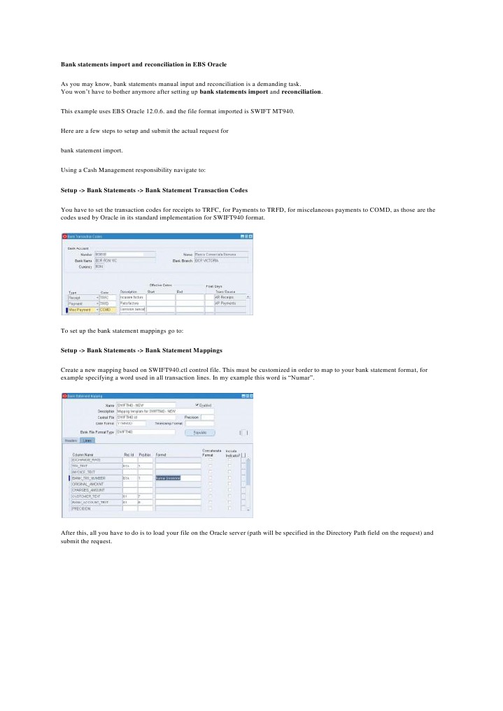 reconciliation is a demanding task. You wont have to bother anymore after setting up bank statements import and reconciliation. This example uses EBS Oracle 12.0.6. and the file format imported is SWIFT MT940. Here are a few steps to setup and submit the actual request for bank statement import. Using a Cash Management responsibility navigate to: Setup -> Bank Statements -> Bank Statement Transaction Codes You have to set the transaction codes for receipts to TRFC, for Payments to TRFD, for miscelaneous payments to COMD, as those are the codes used by Oracle in its standard implementation for SWIFT940 format.