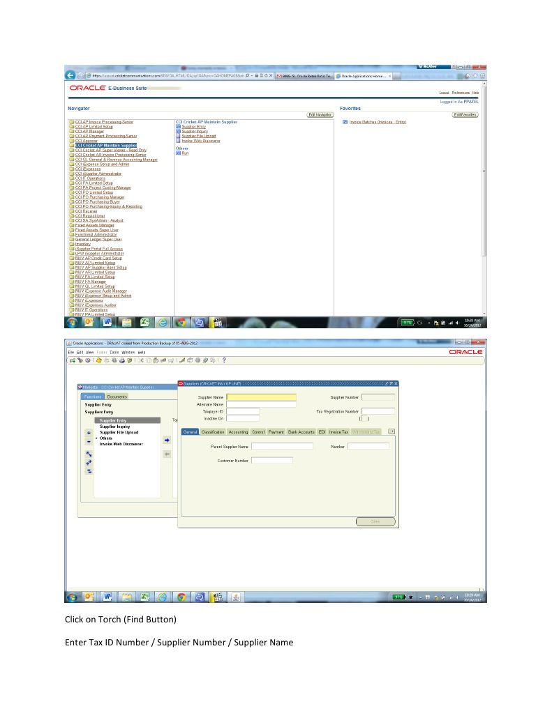 The document provides instructions for finding a supplier by entering their Tax ID Number, Supplier Number, or Supplier Name in the Torch button search field. After clicking Find, the resulting Site name is shown including the City and State. Additional sites can be viewed by using the down arrow. The user can then update or modify the address and save the changes.