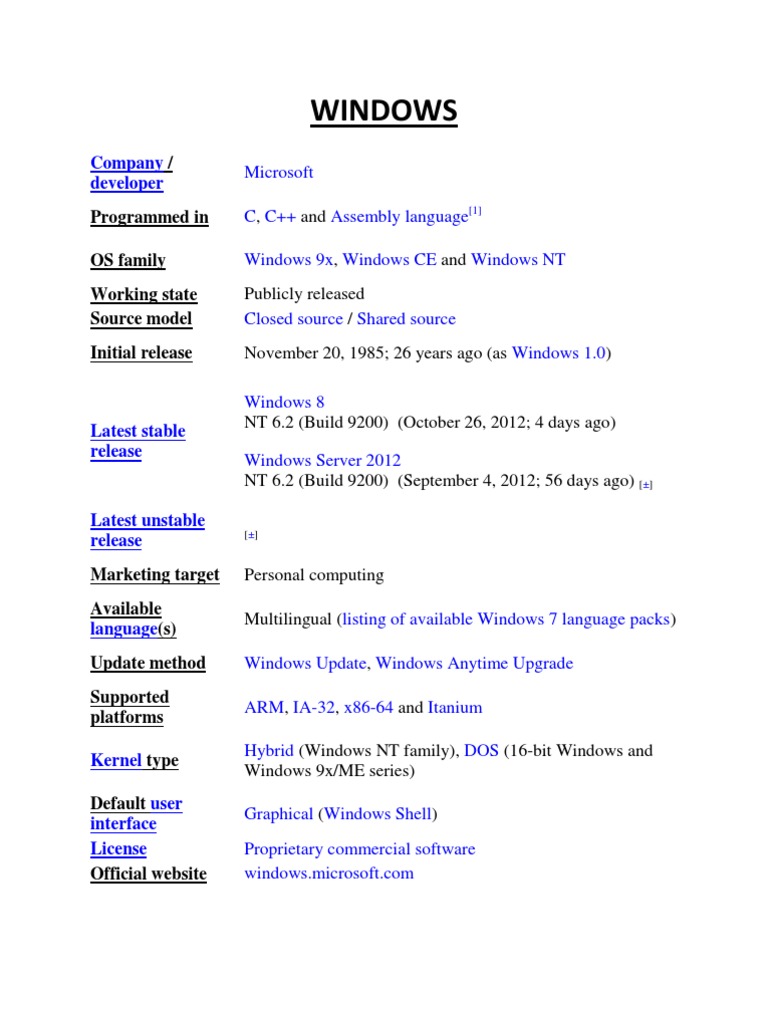 Company / developer Programmed in OS family Working state Source model Initial release Microsoft C, C++ and Assembly language[1] Windows 9x, Windows CE and Windows NT Publicly released Closed source / Shared source November 20, 1985; 26 years ago (as Windows 1.0) Windows 8 NT 6.2 (Build 9200) (October 26, 2012; 4 days ago) Windows Server 2012 NT 6.2 (Build 9200) (September 4, 2012; 56 days ago) []
