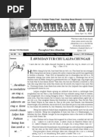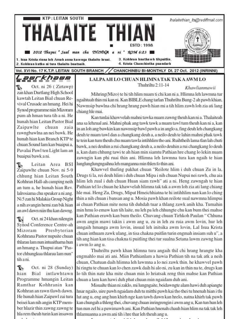 BIAL MEET THLIRLETNA A changin Musical Meet kan nei a, tun tum chu Sports Meet kan nei ve thung. Sports lama tui lemlo te Pi Lalhmangaihi m/o Nl. K Lalrinawmi chu Oct tan chuan a ho viau maithei. Thenkhat tan chuan Muthi ni 6 khan Cancer vangin chatuanram min pan san . khawdaia nisensa hnuaia nilenga va thut kha kan peihlo Pi Lalthansangi w/o Pu Lalthanpuia chuan Oct. tlang hle mai thei. KTP rawngbawlna hi A nuamah pawh, ni 10 khan thawhah vangin chatuan ram min pansan A hrehawmah pawh tih a ngai fo tih min ti hrechhuaktu ta bawk. te pawh ni se. Thenkhat erawh nuam ti tak tak, kham lo Pi Lalhmangaihi leh Pi Lalthansangi te hi KTP tak te pawh kan awm ngei ang. chuan kan dan angin an mahni inah ralna hun kan Inrinni khan a hunah kan tan hman lo tih leh Biakin hmang ve ve a ni. zai , a engamah hmaa tih hot kan han tum nghal ringawt Pi Lalhliri, Ramhlun N m/o Rev. Lalchungnunga leh , tlema music lo chik peih tan Strings ring lutuk, Bass chu Oct. ni 10 khan cancer natna vangin chatuan ram zawi leh si in zai a chawi loh zia te kha sawiselna langsar min pansan ta bawkKhawhar chhungte Thalaite Thian zual te chu a ni mai awm [Link] Branch Item bik han thlir Editorial Board ten kan tuarpui em em a ni. let ila: 1) Worship Dance : Convener Tv C Laremruata Tv. C Lallawmkima chu Durtlang Hospital-ah a fakawm thin khawp mai. Background Music atan Tv. a tonsil zai a ni , dam takin a lo chhuak leh ta. Benson-a Live Vocals khan a ti hluin, sap ho chuan lo Pi Laltlanzovi w/o Lalchawisanga chu Oct. ni en se.. very creative an lo ti sap sap maithei. Tum 26 khan New Life Hospital-ah zai a ni angin lam tur an tam thei lova, dancer 3 chauh kha chuan Pi C Lianzuali w/o Dr. R Lianzama chu Oct. ni ti pui lo deuh mah se a lam te an thiam a, hmuh a nual 27 khan in check-up turin Mumbai lamah a liamthla. khawp mai. 2) Musical Drama : Musical Drama ka hriat ah Kan Joint Editor Pu PD-a nupui Pi MS chuan zai a tlem ber awm e!! An inbuatsaih dan lo Dawngliani, Dawngtei pawh a thawhna hmun hriatpuitu tan chuan kha item kha a huphurhawm lawk Darlawn atangin an naute nen a rawn haw. hle, an mahni lah chuan huphurh hmel an pu map lo ni Hun rei tak atanga ATC-a lo thawk tawh Tv. mai lovin Convener Tv. Joe phei chu a confi hmel Sunil Murmu chuan Oct ni 26 khan ATC Chapelah zawmah. Mahse a hun a lo thleng a, a changtuten stage nupui a nei ta. He hunah hian kan Kohhran Mashihi an ngam a, mipui hmaah TRET TRUT awm hauh lovin Sangati ten zaipawl an nei a ni. show hmuhnawm tak an rawn ti lang thei. A Drama pawh kha Tu fa ngaihtuah chhuah nge? tih mai tura Tunlai kan Branch member exam pawimawh idea tha a ni. Fela & Co rawn Gangnam kha a tak tak nei an awm nual. An exam te tha taka an pass hmuhnawm hle mai. Synod-ah kal zel rawh se han ngei theihnan duhsakna kan hlan e. Pass lawm hunah tih daih mai te pawh a chakawm rum rum mai. pawh Editorial Board memberte chu sawm theih reng 3) Football : Penalty ah Muthi kan hneh a, kan ni . Penalty ah tho Leitan kan hneh lo. Kan branch players te han en hi chuan a hman hman bum kawi theih hi kan Kan Branch Treasurer Pu R Zoremsiama chuan nih duh hmel. Keini aia in-fit zawk Muthi Branch leh Scooty thar a nei ..Kan KTP sum hi a him em ang chu Players nei tha fe zawk Leitan te pawh kan chai ve thei maw.... viau zel. 4) Volleyball : Kan nula te an Champ leh ta. Nisa hnuaiah, khel nawi nawi lova theihtawp chhuaha ball an beng kha hmuh a nuam hle mai. Inkhelh laia kil khata nalhloh hlauh hmel leh no zeta lo ding hmuh tur kan Branch nulate zingah an awmlo khan a tihmuhnawm lehzual. Lamtual lamah pawh kan Branch mipate an chetha hle. Zai laia awrawl tawp tawp a han Halleui pap pap te kha ngaithlak a nuam hle a ni. Hmeichhe lam Nl. Mimi ( c/o Biakin chhak) in a rawn represent a , a ti tha hle mai. Nakum lamah Meet nuam tak hmang leh Bial Meet Khuallian theuh turin Pathian in min veng zel rawh se. ROM 6:23 Sual man chu THIHNA a ni