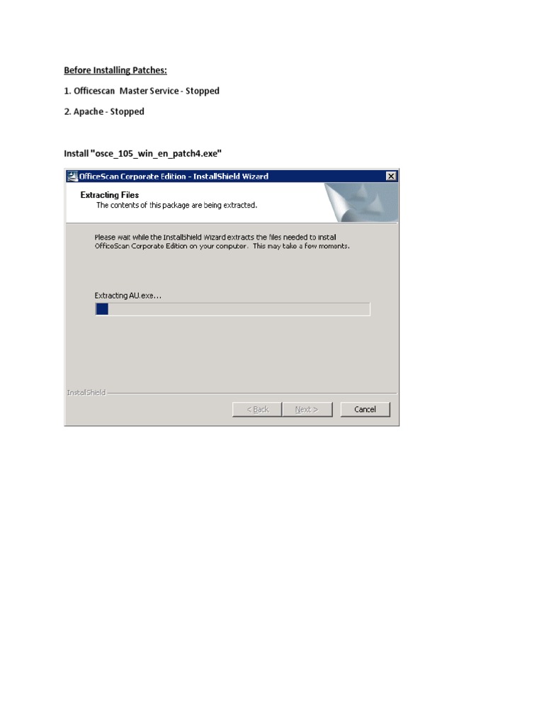 Before Installing Patches: 1. Officescan Master Service - Stopped 2.