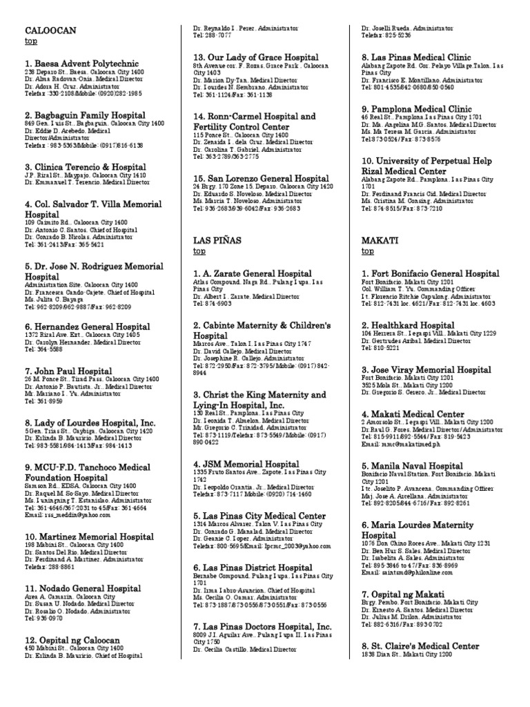 461 Bagumbayan, Taguig 1604 Dr. Narciso G. Osorio, Sr., Medical Director 323 Malinta, Valenzuela 1405 Dr. Amelita Ll. Gonzales, Medical Director Tel: 292-0473/292-0521
