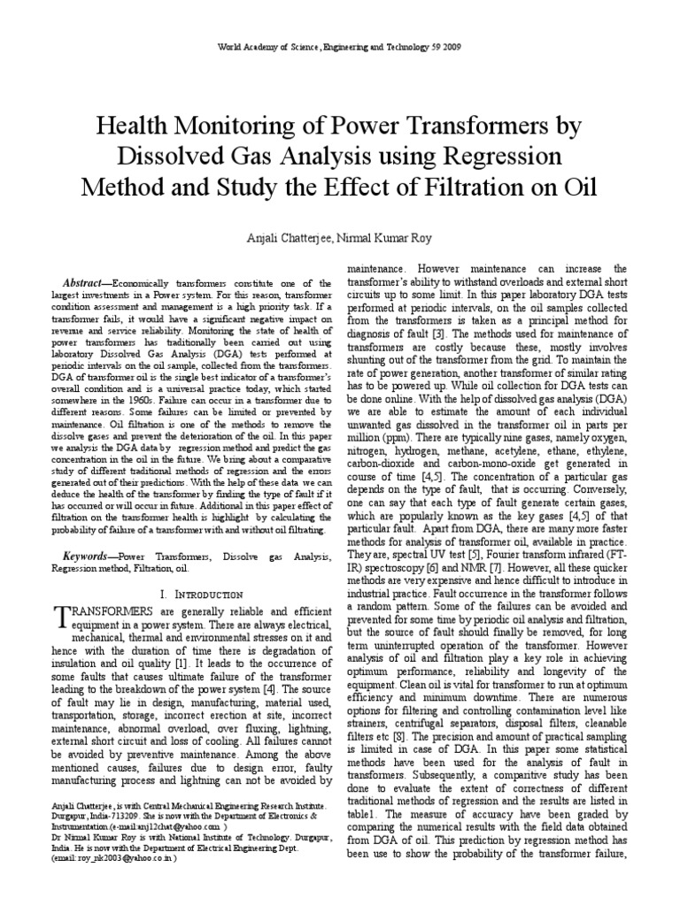 maintenance. However maintenance can increase the transformers ability to withstand overloads and external short circuits up to some limit. In this paper laboratory DGA tests performed at periodic intervals, on the oil samples collected from the transformers is taken as a principal method for diagnosis of fault [3]. The methods used for maintenance of transformers are costly because these, mostly involves shunting out of the transformer from the grid. To maintain the rate of power generation, another transformer of similar rating has to be powered up. While oil collection for DGA tests can be done online. With the help of dissolved gas analysis (DGA) we are able to estimate the amount of each individual unwanted gas dissolved in the transformer oil in parts per million (ppm). There are typically nine gases, namely oxygen, nitrogen, hydrogen, methane, acetylene, ethane, ethylene, carbon-dioxide and carbon-mono-oxide get generated in course of time [4,5]. The concentration of a particular gas depends on the type of fault, that is occurring. Conversely, one can say that each type of fault generate certain gases, which are popularly known as the key gases [4,5] of that particular fault. Apart from DGA, there are many more faster methods for analysis of transformer oil, available in practice. They are, spectral UV test [5], Fourier transform infrared (FTIR) spectroscopy [6] and NMR [7]. However, all these quicker methods are very expensive and hence difficult to introduce in industrial practice. Fault occurrence in the transformer follows a random pattern. Some of the failures can be avoided and prevented for some time by periodic oil analysis and filtration, but the source of fault should finally be removed, for long term uninterrupted operation of the transformer. However analysis of oil and filtration play a key role in achieving optimum performance, reliability and longevity of the equipment. Clean oil is vital for transformer to run at optimum efficiency and minimum downtime. There are numerous options for filtering and controlling contamination level like strainers, centrifugal separators, disposal filters, cleanable filters etc [8]. The precision and amount of practical sampling is limited in case of DGA. In this paper some statistical methods have been used for the analysis of fault in transformers. Subsequently, a comparitive study has been done to evaluate the extent of correctness of different traditional methods of regression and the results are listed in table1. The measure of accuracy have been graded by comparing the numerical results with the field data obtained from DGA of oil. This prediction by regression method has been use to show the probability of the transformer failure,