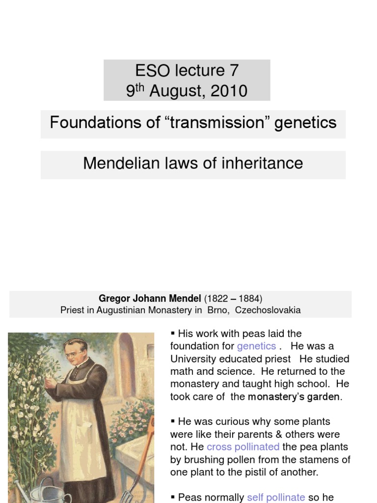 ESO lecture 7 9th August, 2010 Foundations of transmission genetics Mendelian laws of inheritance