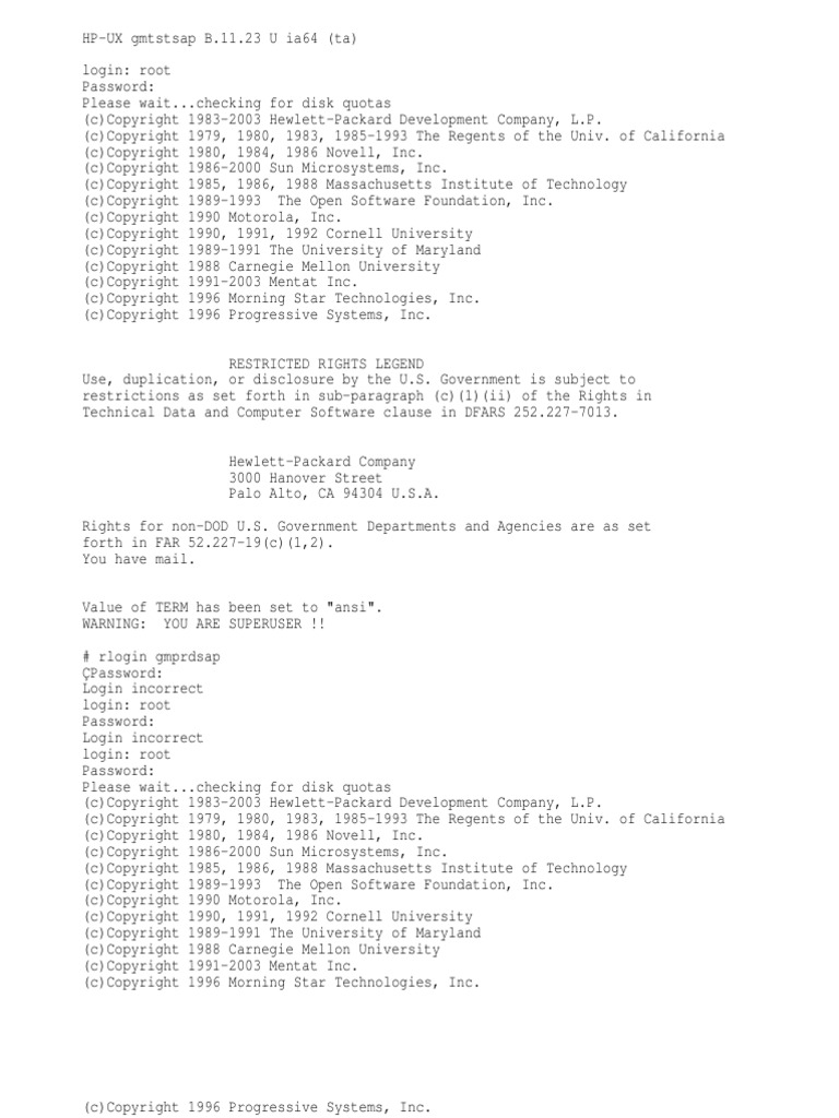 checking for disk quotas (c)Copyright 1983-2003 Hewlett-Packard Development Company, L.P. (c)Copyright 1979, 1980, 1983, 1985-1993 The Regents of the Univ. of California (c)Copyright 1980, 1984, 1986 Novell, Inc. (c)Copyright 1986-2000 Sun Microsystems, Inc. (c)Copyright 1985, 1986, 1988 Massachusetts Institute of Technology (c)Copyright 1989-1993 The Open Software Foundation, Inc. (c)Copyright 1990 Motorola, Inc. (c)Copyright 1990, 1991, 1992 Cornell University (c)Copyright 1989-1991 The University of Maryland (c)Copyright 1988 Carnegie Mellon University (c)Copyright 1991-2003 Mentat Inc. (c)Copyright 1996 Morning Star Technologies, Inc. (c)Copyright 1996 Progressive Systems, Inc. RESTRICTED RIGHTS LEGEND Use, duplication, or disclosure by the U.S. Government is subject to restrictions as set forth in sub-paragraph (c)(1)(ii) of the Rights in Technical Data and Computer Software clause in DFARS 252.227-7013. Hewlett-Packard Company 3000 Hanover Street Palo Alto, CA 94304 U.S.A. Rights for non-DOD U.S. Government Departments and Agencies are as set forth in FAR 52.227-19(c)(1,2). You have mail. Value of TERM has been set to "ansi". WARNING: YOU ARE SUPERUSER !! # rlogin gmprdsap Password: Login incorrect login: root Password: Login incorrect login: root Password: Please wait...checking for disk quotas (c)Copyright 1983-2003 Hewlett-Packard Development Company, L.P. (c)Copyright 1979, 1980, 1983, 1985-1993 The Regents of the Univ. of California (c)Copyright 1980, 1984, 1986 Novell, Inc. (c)Copyright 1986-2000 Sun Microsystems, Inc. (c)Copyright 1985, 1986, 1988 Massachusetts Institute of Technology (c)Copyright 1989-1993 The Open Software Foundation, Inc. (c)Copyright 1990 Motorola, Inc. (c)Copyright 1990, 1991, 1992 Cornell University (c)Copyright 1989-1991 The University of Maryland (c)Copyright 1988 Carnegie Mellon University (c)Copyright 1991-2003 Mentat Inc. (c)Copyright 1996 Morning Star Technologies, Inc.