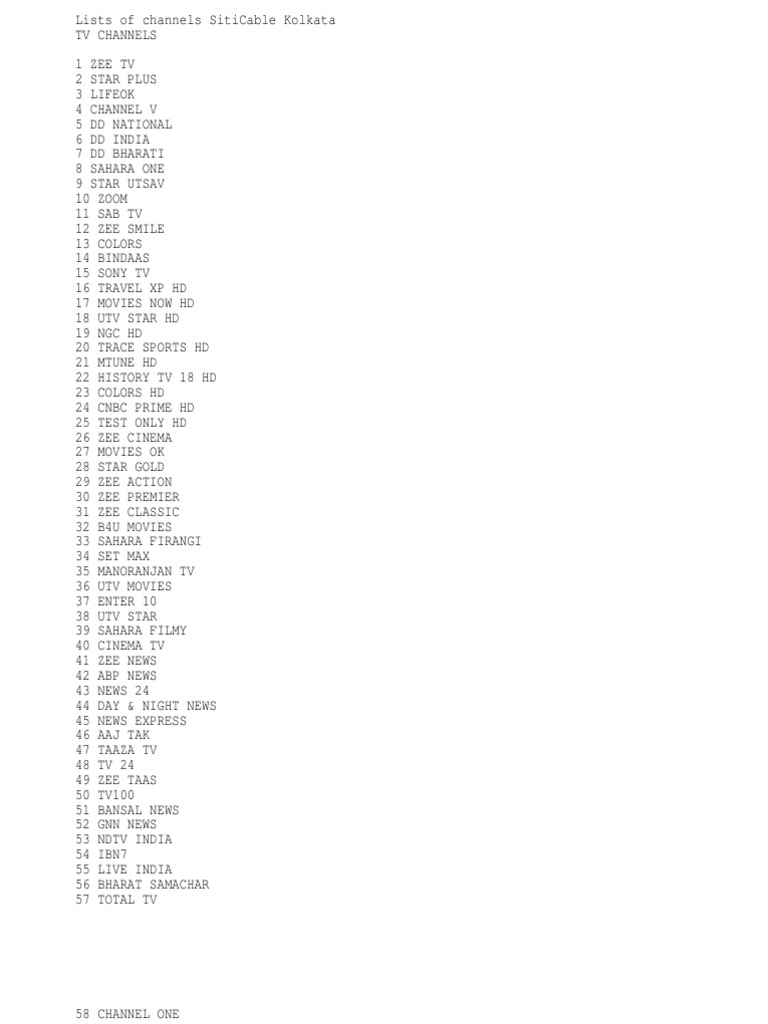 Lists of channels SitiCable Kolkata TV CHANNELS 1 ZEE TV 2 STAR PLUS 3 LIFEOK 4 CHANNEL V 5 DD NATIONAL 6 DD INDIA 7 DD BHARATI 8 SAHARA ONE