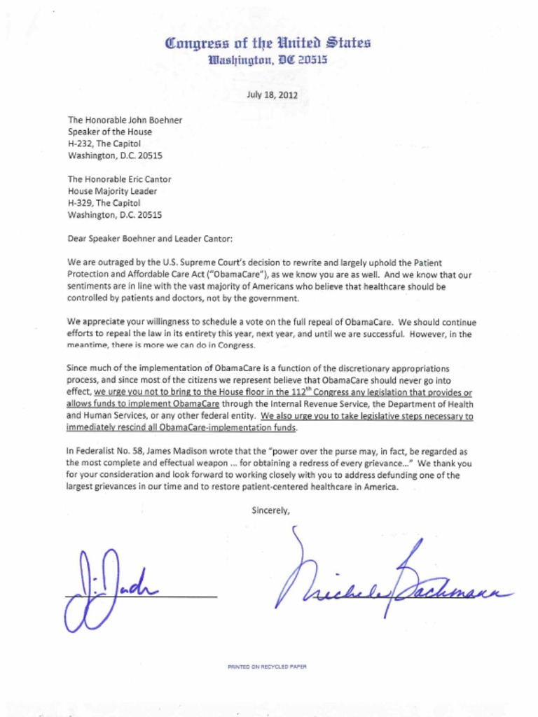 Letter urging Boehner not to fund Obamacare in any form through the House of Representatives. It is to be seen if Boehner has the spine.