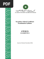 Topics and Student Learning Outcomes of the Examination Syllabus Part I (Class IX) Topic Student Learning Outcomes Candidates should be able to: 1.1.1 1.1.2 1.1.3 1.1.4 1.2.1 1.2.2 1.2.3 1.2.4 1.3 Significance of civics in society and in Pakistans context 1.3.1 1.3.2 define Civics; describe usefulness of Civics as a subject to fulfill the needs of society; describe how civics can improve the citizenship; identify the common terms used in Civics; e.g. society, state, government, democracy; identify different aspects of Civics in every day life; e.g. the rule of law, Pakistani identity, patriotism, family values and networks; state the nature of civic relationships within various groups; distinguish Civics from Sociology, Ethics, Economics, History and Human Geography; explain the priorities of civic relationships in a specific social setup; analyse the significance of civics specially keeping in view the cultural context of Pakistan; discuss the benefits to the young citizens of Pakistan of being educated in their civic responsibilities. * * * * * * * * * * Cognitive Level2 K U A
