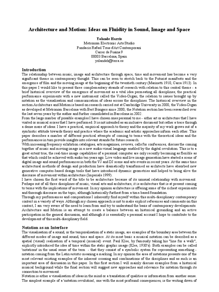 The relationship between music, image and architecture through space, time and movement has become a very significant theme in contemporary thought. This can be seen to stretch back to the Futurist manifesto and the emergence of film and the moving image at the beginning of the twentieth century (Marinetti 1910, Carra 1913). In this paper I would like to present three complementary strands of research with relation to this central theme - a brief historical overview of the emergence of movement as a vital idea permeating all disciplines; the practical performance experiments with a new instrument called the Video-Organ; the relation to issues brought up by notation as the visualisation and communication of ideas across the disciplines. The historical overview in the section Architecture and Motion is based on research carried out at Cambridge University in 2000, the Video-Organ as developed at Metronom Barcelona with Bert Bongers since 2000, the Notation section has been researched over the last seven years by the author and further consolidated in Barcelona in 2002. From the large number of possible examples I have chosen ones personal to me - either art or architecture that I have visited or musical scores that I have performed. It is not intended as an inclusive document but rather a trace through a dense maze of ideas. I have a practical, empirical approach to theory and the majority of my work grows out of a symbiotic attitude towards theory and practice where the academic and artistic approaches inform each other. This paper describes a number of different practical attempts of coming to terms with the theoretical ideas and the performances in turn provide insights into relevant strands for future research. With increasing frequency exhibition catalogues, arts magazines, reviews, calls for conferences, discuss the coming together of music and moving image in a new audio-visual language enabled by the digital revolution. This is to a great extent true, the real-time image capabilities of a personal computer are only recently becoming as flexible as that which could be achieved with audio ten years ago. Live video and live image generation have started a scene of digital image and sound performances in both the VJ and DJ scene and arts events in recent years. At the same time architectural methods of design and production have dramatically transformed as architects have absorbed new generative computer-based design tools that have introduced dynamic geometries and helped to bring alive the discourse of movement within architecture (Imperiale 1999). I have chosen the first word of the title to be architecture because of its unusual relationship with movement. Perhaps out of all three disciplines of music, visual arts and architecture, it is architecture that is at present coming to terms with the implications of movement. In my opinion architecture is offering some of the richest experiments and thorough discourse on the topic, although historically furthest from a time-based foundation. Through my performances and compositions I inherently find myself within this multi-disciplinary contemporary context in a variety of ways. Although my chosen approach is not to make explicit references and comments on this context, I am very aware of the need to learn from and try to understand the basis of contemporary developments. Architecture and Motion is an attempt to create a balance between an historical grounding and an active participation in the general discussion, and although it is essentially a personal account I hope to contribute to the development of this multi-disciplinary field.