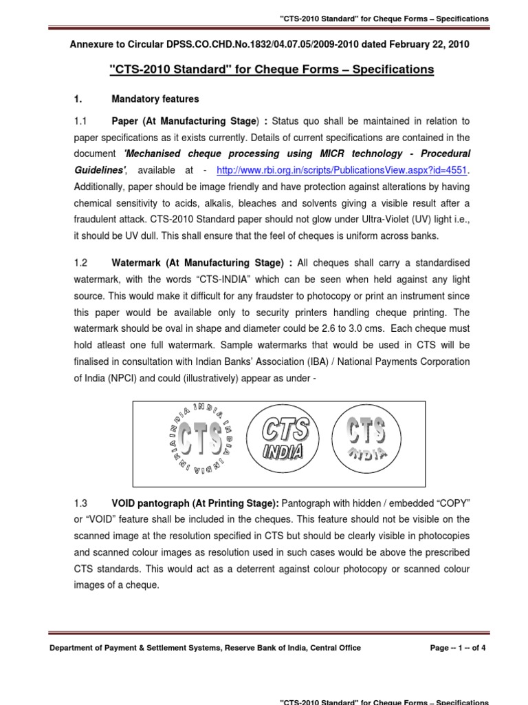 RBI Circular DPSS - CO.CHD - No.1832/04.07.05/2009-2010 Dated February 22, 2010 - "CTS 2010 Standard"