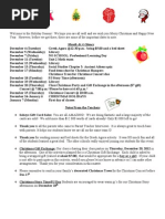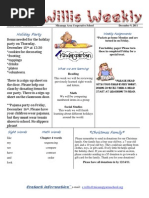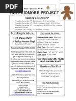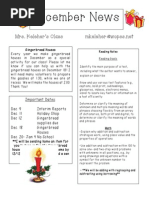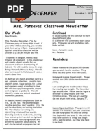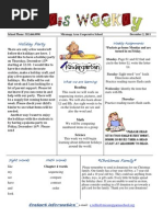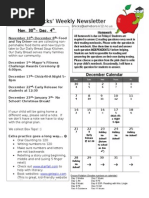 -Our holiday party is on Wednesday, Dec. 19th at 11:00. Students will enjoy working on a craft, and we will have lunch snacks afterward. Please send in a new or gently used book, wrapped for a book exchange. If you have not signed up to send in a snack to share, please do. I have a sign up sheet on the door of the classroom. Thanks! -Please see attached note regarding our program supporting families during the holidays. Thanks!