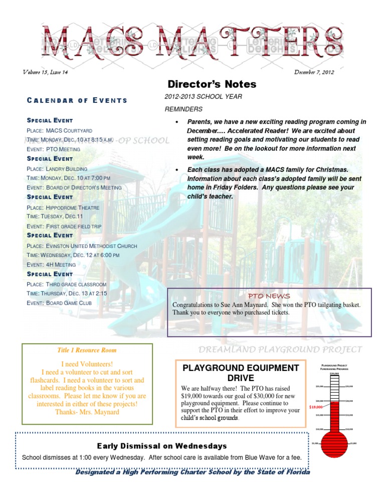 2012-2013 SCHOOL YEAR REMINDERS Parents, we have a new exciting reading program coming in December. Accelerated Reader! We are excited about setting reading goals and motivating our students to read even more! Be on the lookout for more information next week. Each class has adopted a MACS family for Christmas. Information about each classs adopted family will be sent home in Friday Folders. Any questions please see your childs teacher.