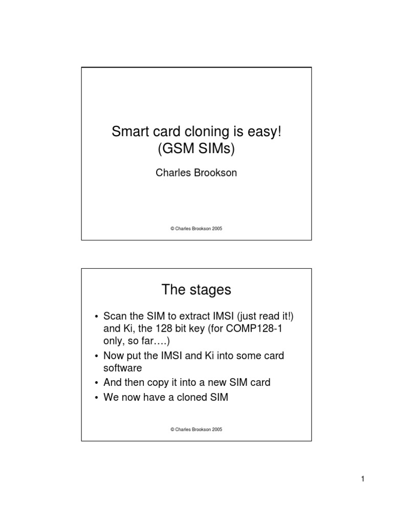 Scan the SIM to extract IMSI (just read it!) and Ki, the 128 bit key (for COMP128-1 only, so far.) Now put the IMSI and Ki into some card software And then copy it into a new SIM card We now have a cloned SIM